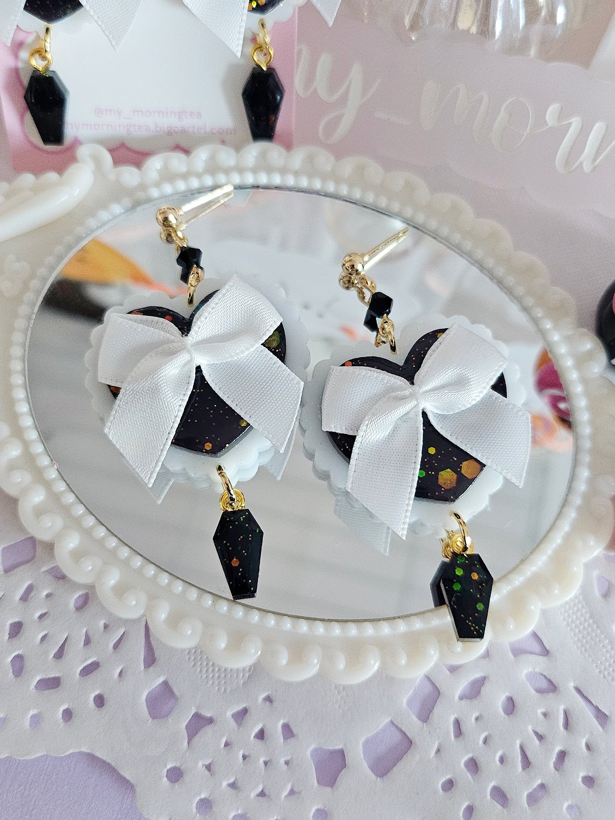 Heart shaped earrings with coffin motifs. Perfect for spooky season!